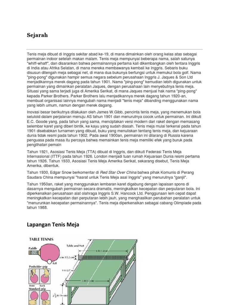 Game Set Dalam Permainan Tenis Meja Untuk Putri Adalah A 20 Angka B 21 Angka C 25 Angka D 15 Brainly Co Id from id-static.z-dn.net Tenis meja memiliki 4 teknik dasar yang perlu dikuasai oleh setiap pemain. Sebaris buku disusun ditengah meja sebagai net, di mana dua bukunya berfungsi untuk memukul bola golf. Perhatikan perbedaan antara game, set, dan match. Tenis meja mempunyai beberapa nama, salah satunya whiff whaff, dan disarankan bahwa permainannya pertama kali dikembangkan oleh tentara inggris di india atau afrika selatan, di mana mereka membawanya kembali ke inggris. Servis harus dilakukan dari belakang batas akhir meja. See full list on id.wikipedia.org Apakah tenis meja berasal dari meja? See full list on id.wikipedia.org